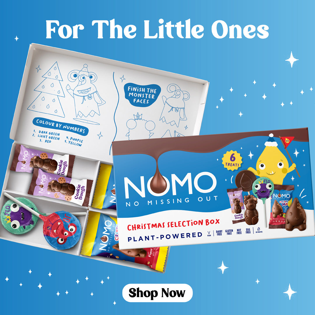 If you’re looking for the perfect Christmas chocolates for kids, the NOMO Kids Selection Box is the one to look out for. Packed with Mini Cookie Dough Reindeers, Crispy Mo treats, and creamy chocolate lollies, it’s full of fun activities and festive surprises. Every treat inside this box of dairy free Christmas chocolate is completely plant-powered and free from, proving that vegan Christmas chocolate can be just as exciting for little ones!