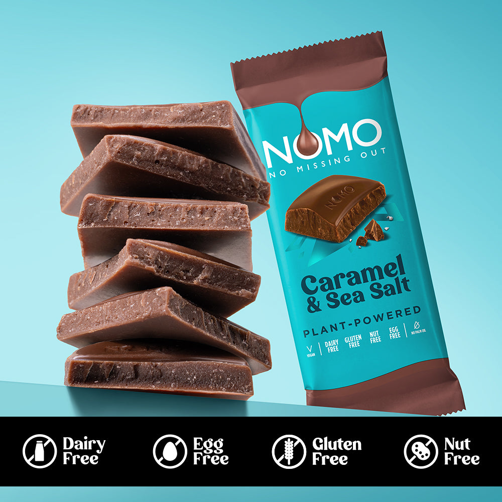 NOMO Creamy Chocolate Large Bars NOMO Caramel & Sea Salt Chocolate Large Bars 75g = 4 x 18.8g (6 piece logo) Per 100g Per 18.8g Energy 2351kJ 441kJ 563kcal 106kcal Fat 34g 6.3g -of which saturates 20g 3.7g Carbohydrate 62g 12g -of which sugars 33g 6.2g Protein 2.4g 0.5g Salt 0.09g 0.02g 75g = 4 x 18.8g (6 piece logo) Per 100g Per 18.8g Energy 2341kJ 441kJ 561kcal 106kcal Fat 33g 6.3g -of which saturates 19g 3.6g Carbohydrate 62g 12g -of which sugars 33g 6.2g Protein 2.5g 0.5g Salt 0.28g 0.05g
